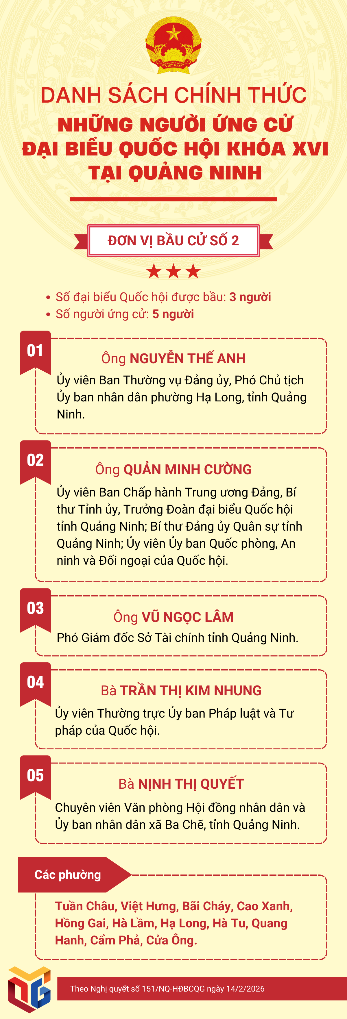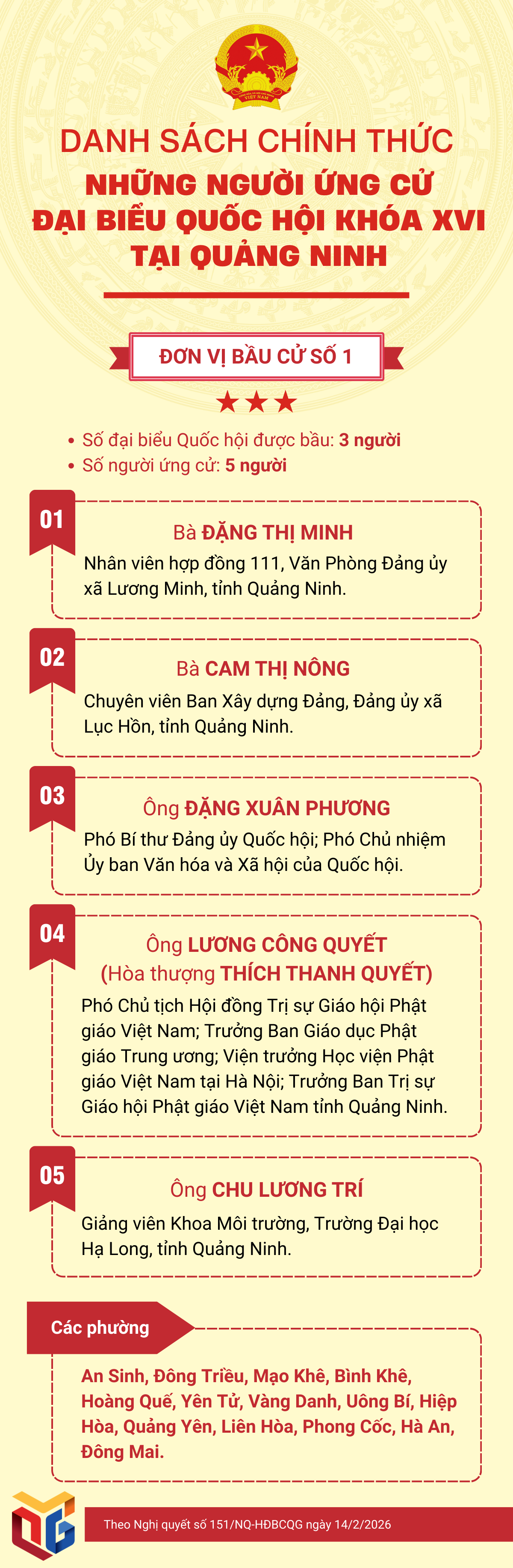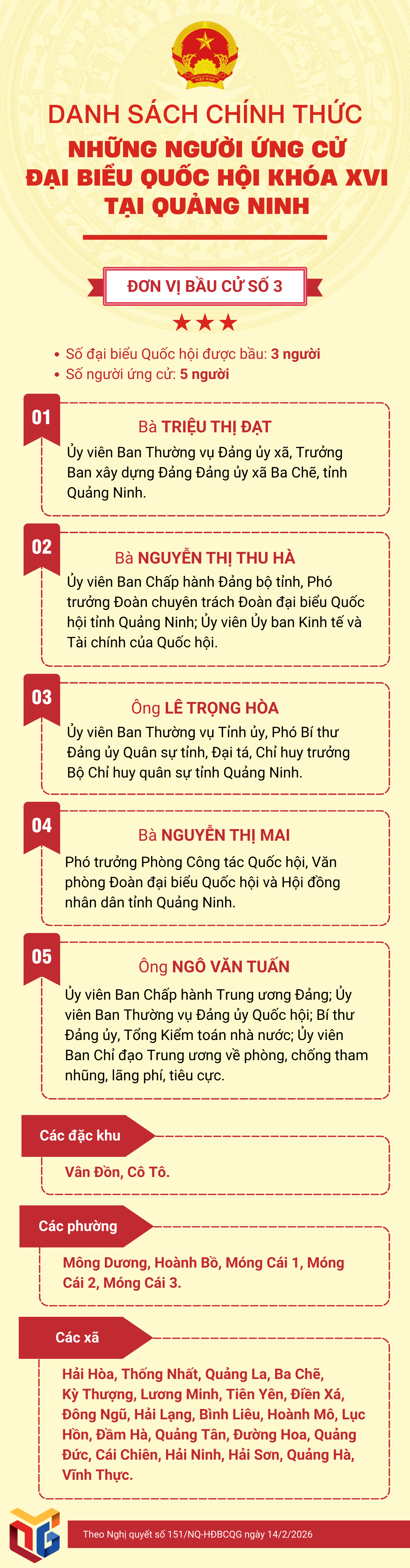 Thay mặt Hội đồng Bầu cử quốc gia, Chủ tịch Quốc hội Trần Thanh Mẫn vừa ký ban hành Nghị quyết số 151/NQ-HĐBCQG ngày 14/2/2026 công bố danh sách chính thức những người ứng cử đại biểu Quốc hội Việt Nam khóa XVI. Theo nghị quyết, cả nước có 864 người ứng cử tại 182 đơn vị bầu cử để bầu 500 đại biểu Quốc hội khóa XVI. Nghị quyết có hiệu lực từ ngày ký ban hành. Trong đó, tại Quảng Ninh có 3 đơn vị bầu cử, 15 người ứng cử để bầu 9 đại biểu Quốc hội. Cụ thể: