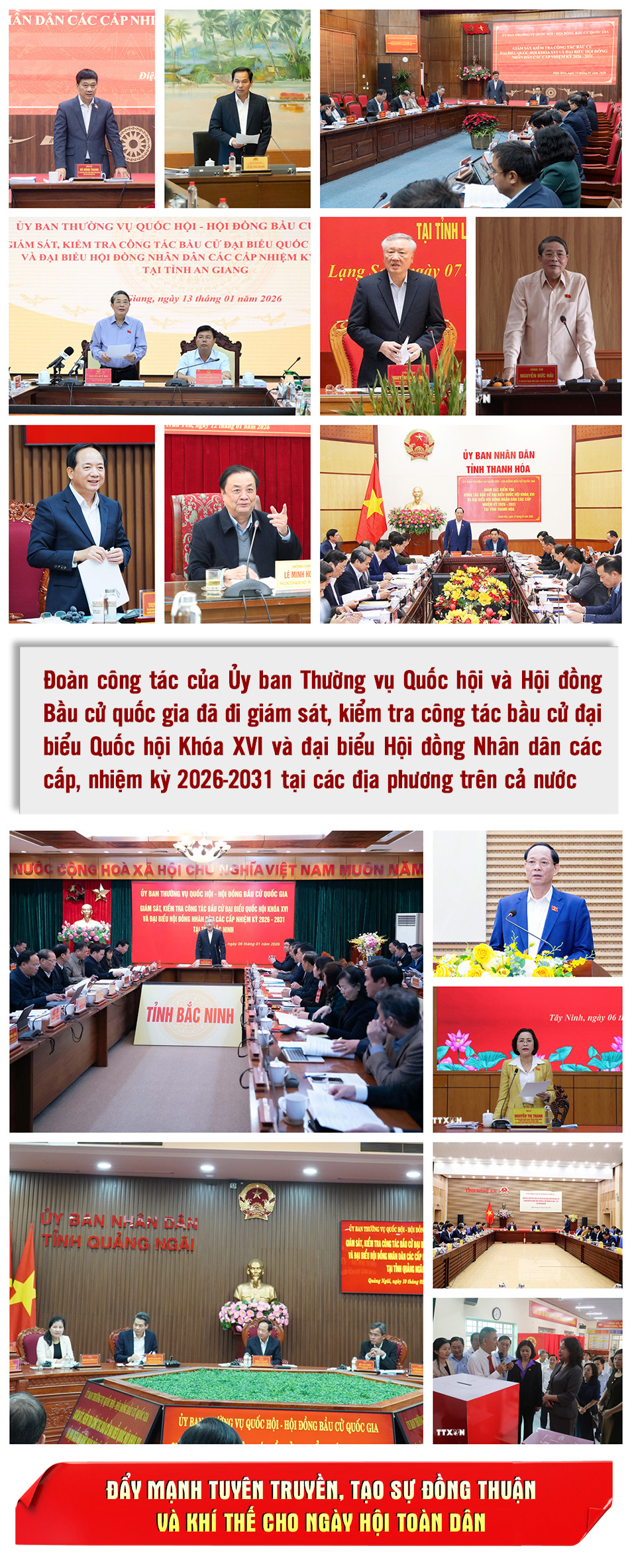 Chủ tịch Quốc hội Trần Thanh Mẫn, Chủ tịch Hội đồng Bầu cử quốc gia khi phát biểu trong các phiên họp của Hội đồng bầu cử Quốc gia, Ủy ban Thường vụ Quốc hội, cũng như trong nhiều cuộc giám sát, kiểm tra thực tế tại các địa phương và phát biểu chỉ đạo trên nhiều diễn đàn chính thức, đã liên tục nhấn mạnh những yêu cầu mang tính xuyên suốt, thể hiện quyết tâm chính trị cao độ trong công tác chuẩn bị đảm bảo cho cuộc bầu cử đại biểu Quốc hội khóa XVI và đại biểu Hội đồng nhân dân các cấp nhiệm kỳ 2026 - 2031 diễn ra thành công tốt đẹp, thực sự là “Ngày hội non sông”. Theo Chủ tịch Quốc hội, cuộc bầu cử lần này diễn ra trong bối cảnh đất nước bước vào giai đoạn phát triển mới với việc vận hành mô hình chính quyền địa phương hai cấp, có những yêu cầu cao hơn về chất lượng đại biểu đại diện, hiệu lực quản trị và chuyển đổi số. Do đó, toàn bộ công tác chuẩn bị phải được triển khai sớm, bài bản, đồng bộ, chặt chẽ, tuyệt đối không để xảy ra tình trạng bị động, lúng túng, nhất là ở cơ sở. Tinh thần chỉ đạo được quán triệt xuyên suốt là “rõ việc, rõ người, rõ trách nhiệm, rõ tiến độ, rõ sản phẩm”, gắn trách nhiệm trực tiếp của người đứng đầu, tăng cường cơ chế giao ban, báo cáo nhanh và kiểm tra thường xuyên, kịp thời chấn chỉnh những thiếu sót ngay từ đầu.
